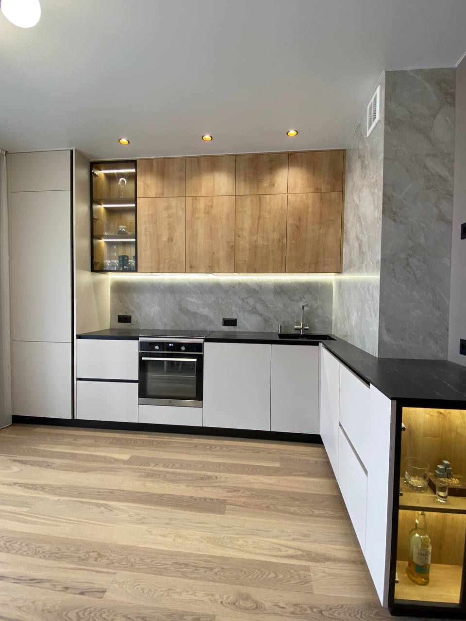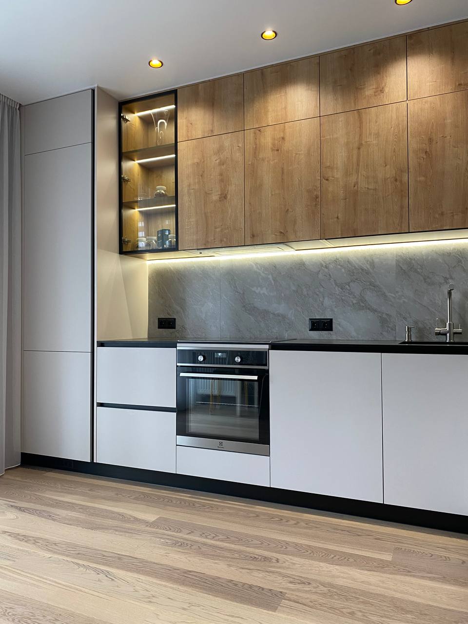 Фасады кухни исполнены из ламинированного ДСП Egger в расцветке Кашемир и Дуб Гамильтон натуральный