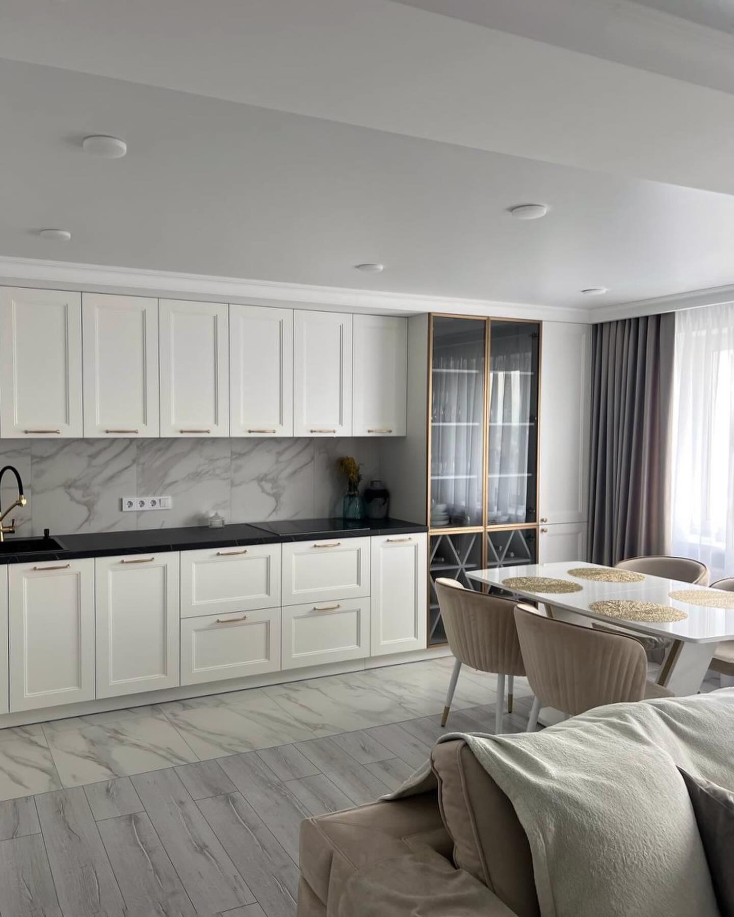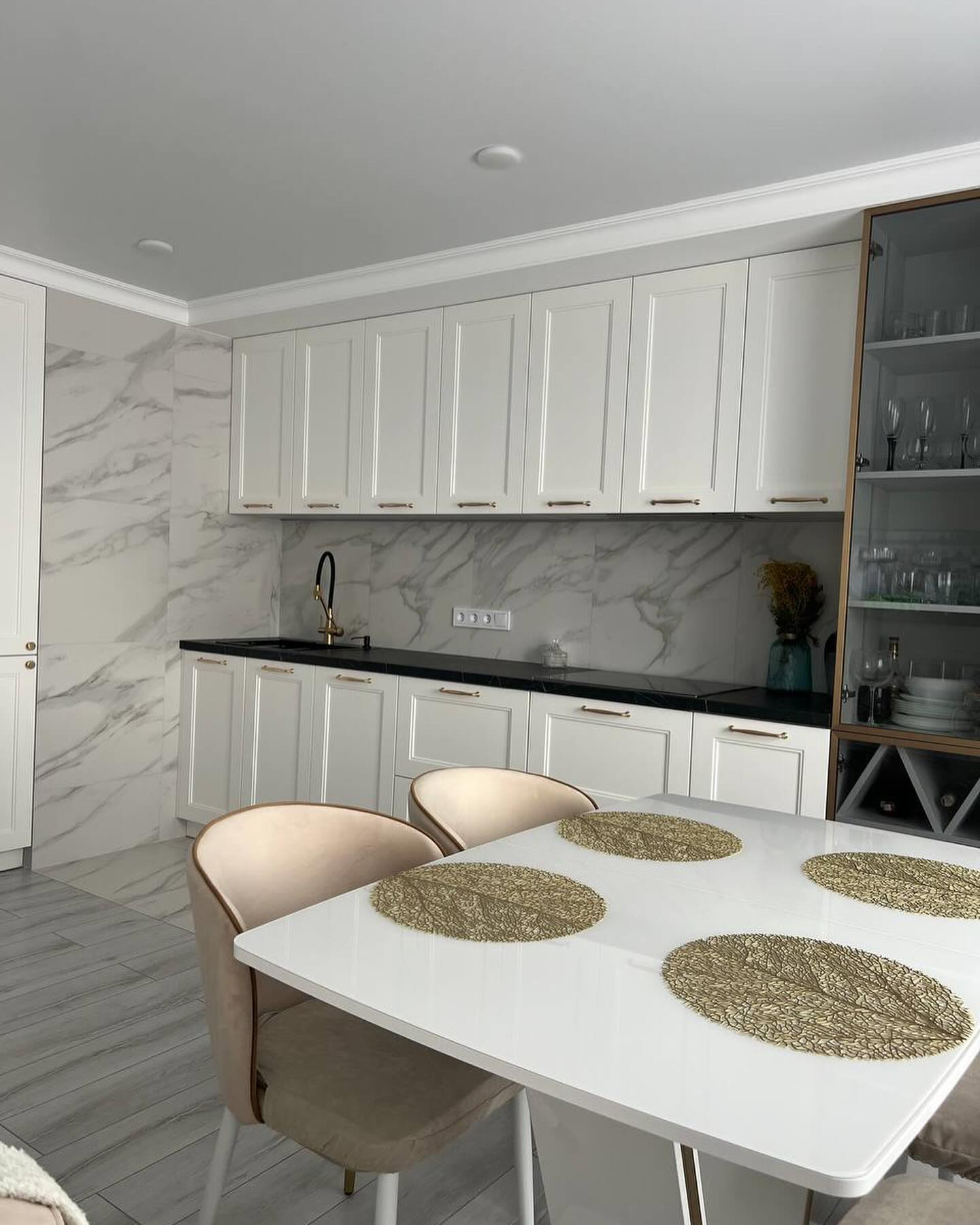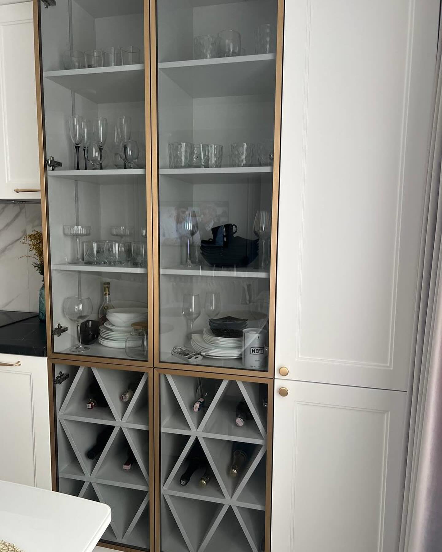 Фасады из крашеного МДФ с фрезеровкой. Столешница - постформинг. Бутылочница собственного производства, фурнитура - Blum